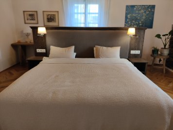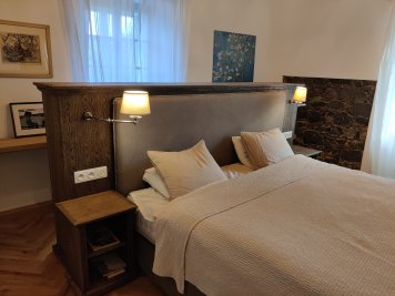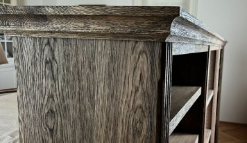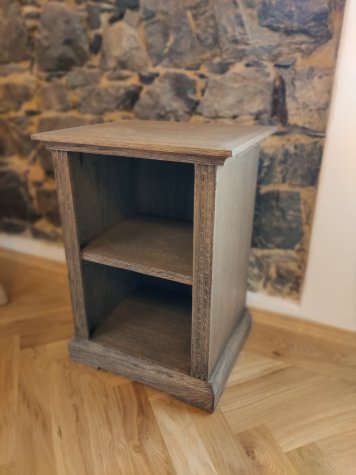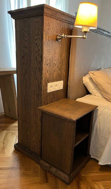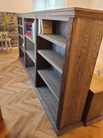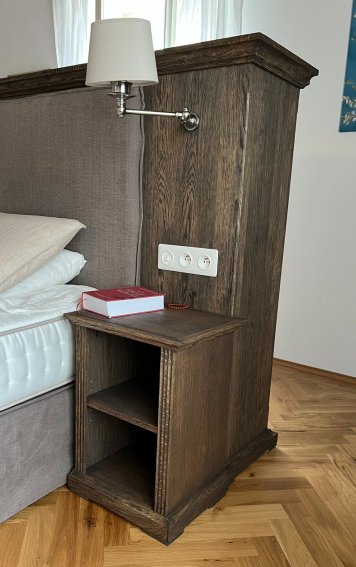 Dubová knihovna ze stařeného dubu. Pohledově oboustranná dubová knihovna opracována kartáčováním a povrchově ošetřena dekoračním voskem OSMO. Knihovna tvoří z jedné strany čelo postele a z druhé strany naplňuje svojí funkci. Noční stolky jsou samostatně stojící, avšak společně s osvětlením a ovládacími prvky ucelují dobový ráz s komfortem celé ložnice.