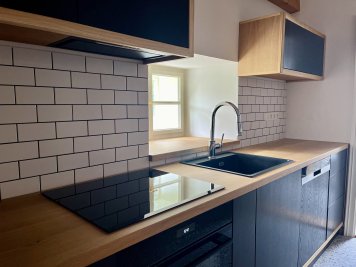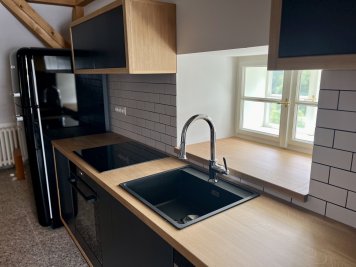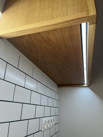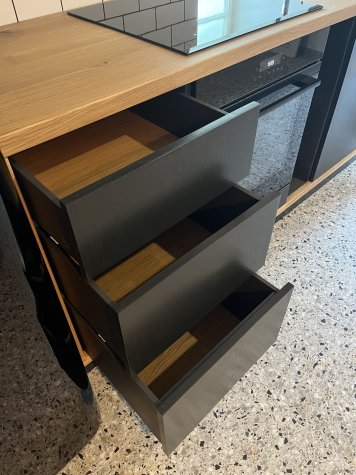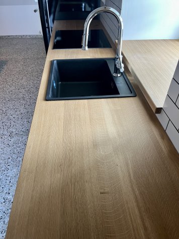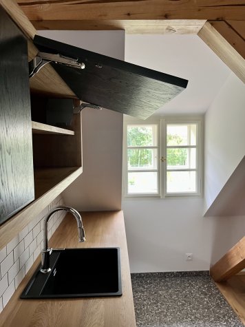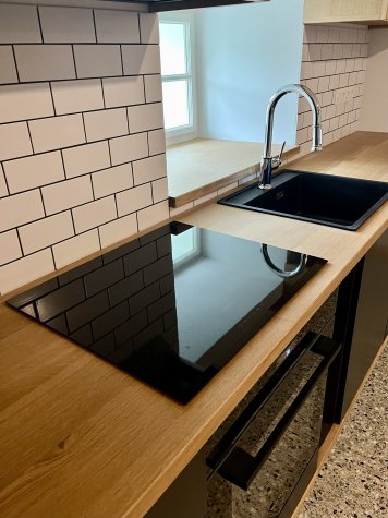Rovná kuchyňská linka dlouhá 5,2 metru s masivní dubovou pracovní deskou o síle 38 mm, ošetřenou voskovým olejem OSMO pro zátěžové plochy a kontakt s potravinami. Dvířka a čela zásuvek dýhovaná LTD dub, ošetřena barvou Tikkurila - symphony - antracit. Výklopný systém horních dvířek Blum Aventos, který je společně se zásuvkami řešen bezúchytkovým systémem otevírání ''push to open''. Díky tomu bylo možné zachovat kompaktní linie a plochy, které jsou pro tento design charakteristické.