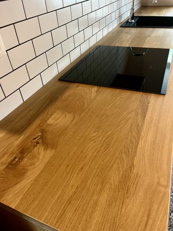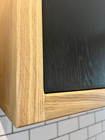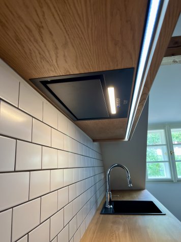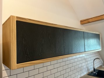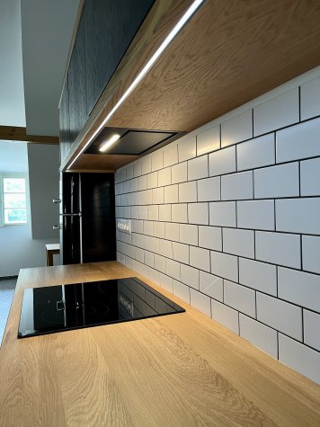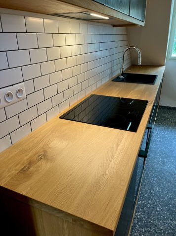 Rovná kuchyňská linka dlouhá 5,2 metru s masivní dubovou pracovní deskou o síle 38 mm, ošetřenou voskovým olejem OSMO pro zátěžové plochy a kontakt s potravinami. Dvířka a čela zásuvek dýhovaná LTD dub, ošetřena barvou Tikkurila - symphony - antracit. Výklopný systém horních dvířek Blum Aventos, který je společně se zásuvkami řešen bezúchytkovým systémem otevírání ''push to open''. Díky tomu bylo možné zachovat kompaktní linie a plochy, které jsou pro tento design charakteristické.